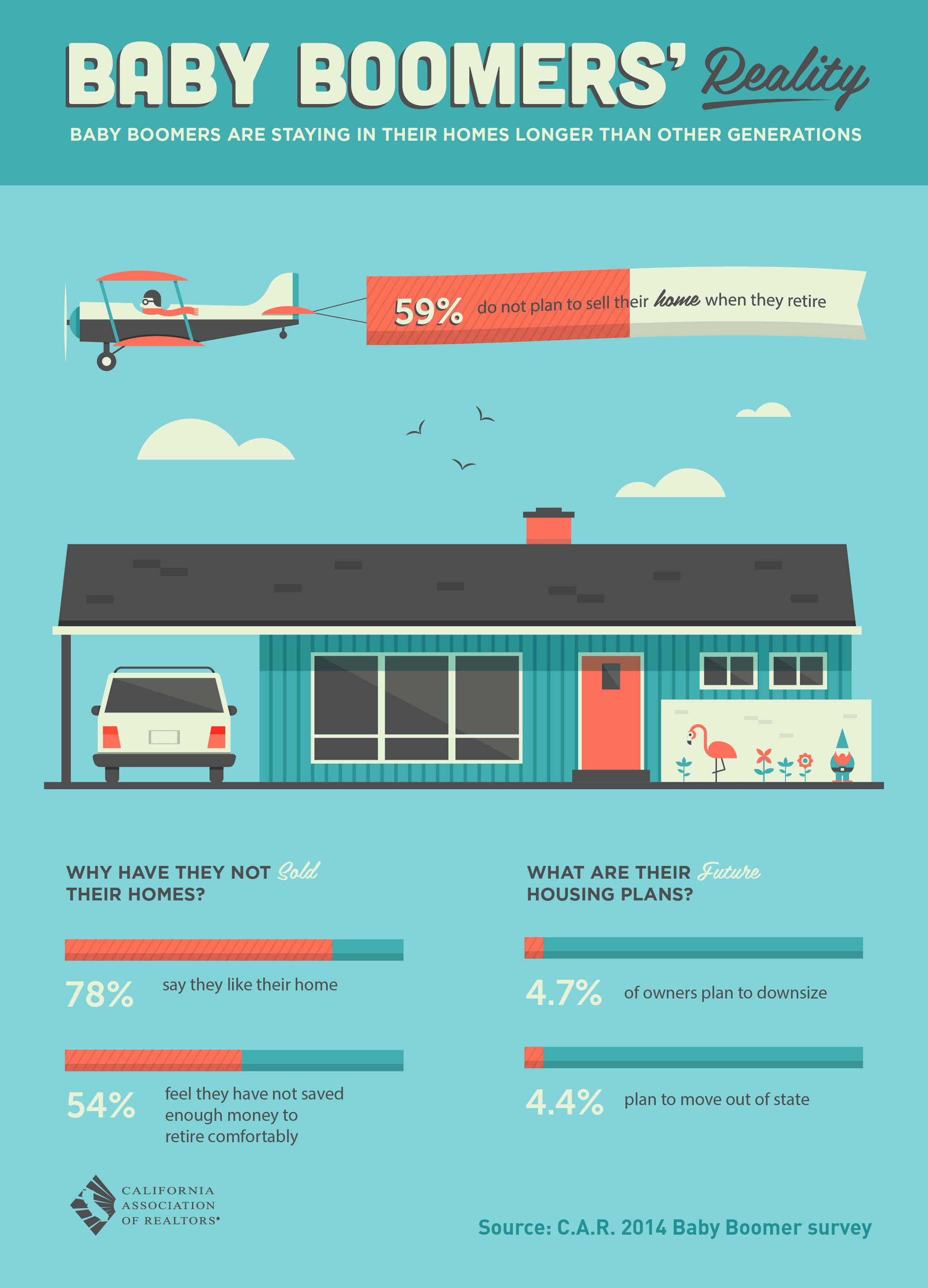 According to a California Association of Realtors® 2014 baby boomers survey, baby boomers are staying in the homes longer than other generation.